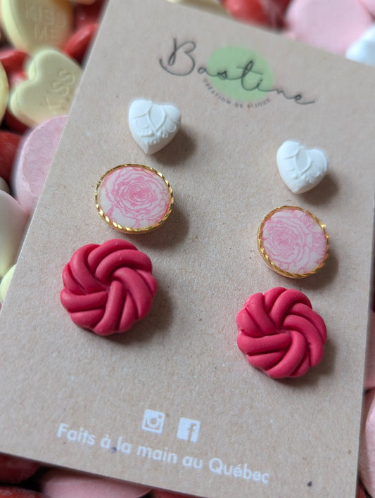 Trio St-Valentin - Boucles d'oreilles studs en argile polymère acier inoxydable hypoallergène