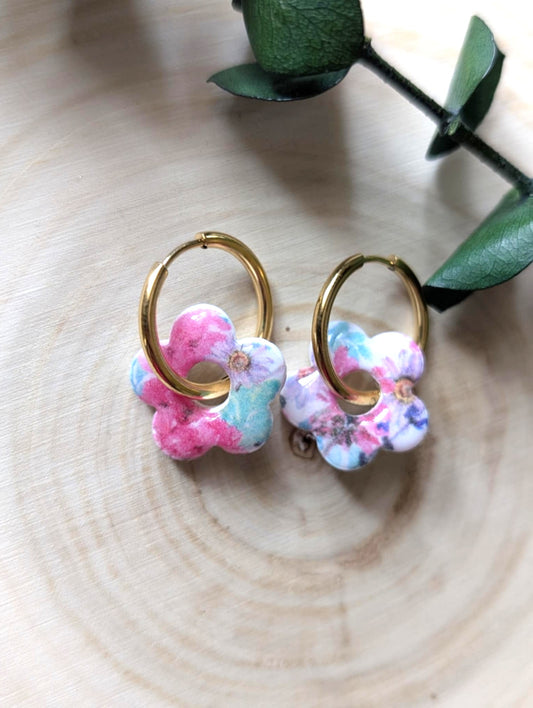 Créoles fleuries sauge - Boucles d'oreilles en argile polymère et acier inoxydable hypoallergène