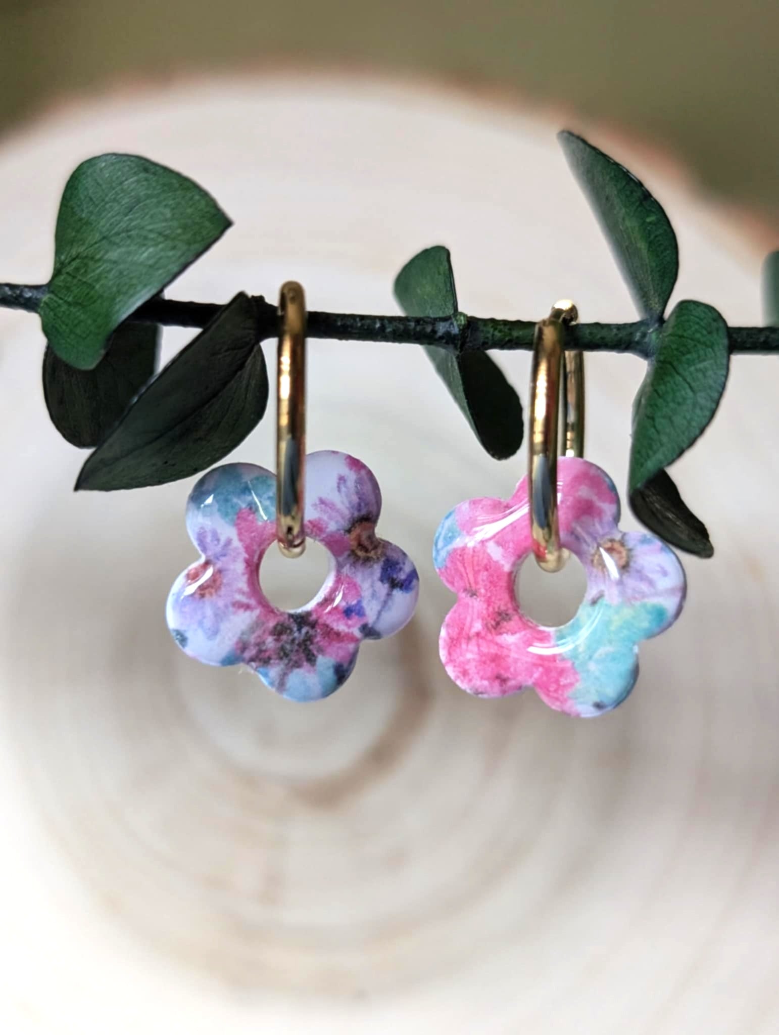 Add a touch of freshness and femininity to your look with our stainless steel hoop earrings adorned with textured pink flower charms. These earrings, handmade in Quebec, combine delicacy and durability. Each polymer clay flower is meticulously modeled to create a unique textured effect that captures the light and attention.