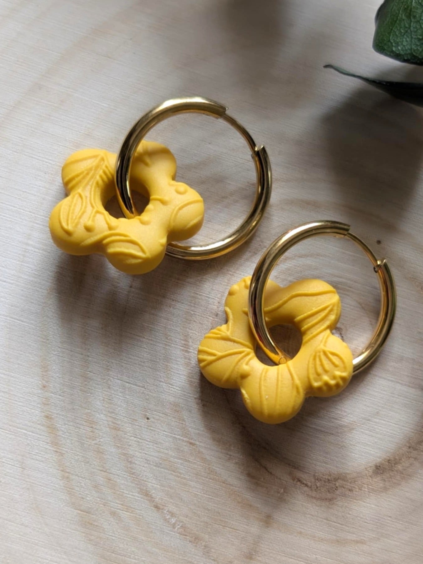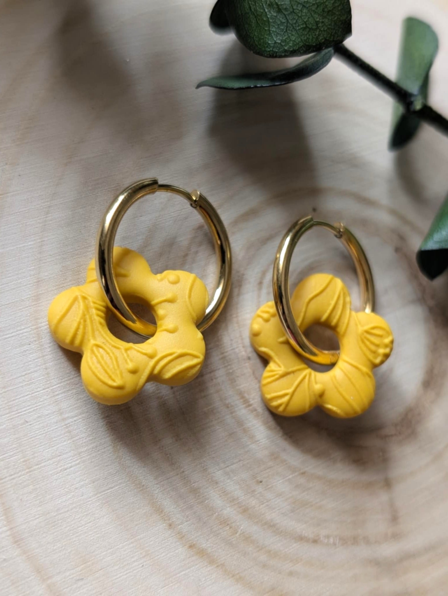 Add a touch of freshness and femininity to your look with our stainless steel hoop earrings adorned with textured pink flower charms. These earrings, handmade in Quebec, combine delicacy and durability. Each polymer clay flower is meticulously modeled to create a unique textured effect that captures the light and attention.