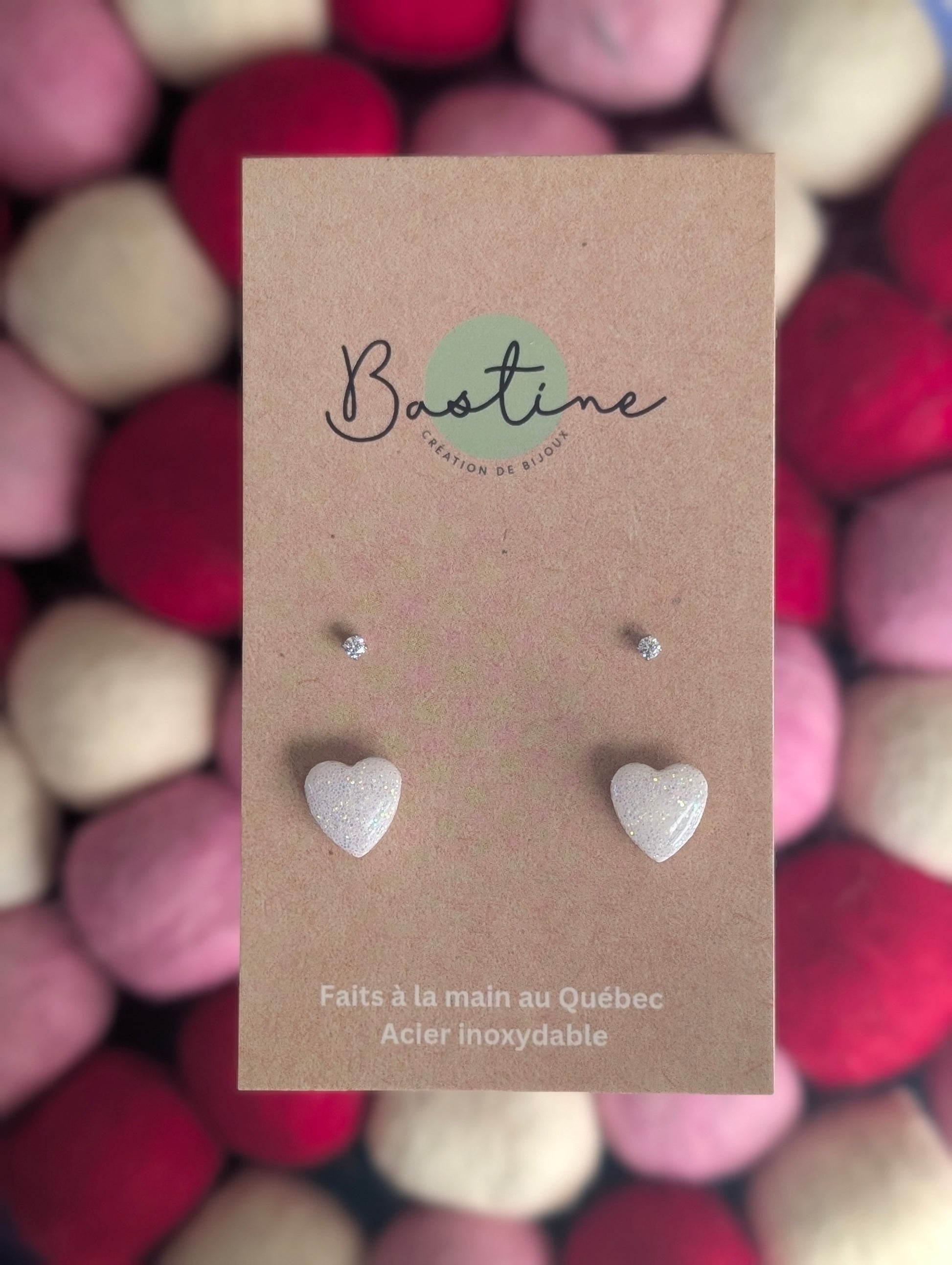 Duo coeurs blancs scintillants- Boucles d'oreilles studs en argile polymère, zircons et acier inoxydable hypoallergène