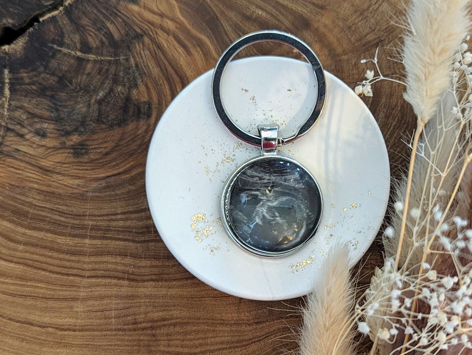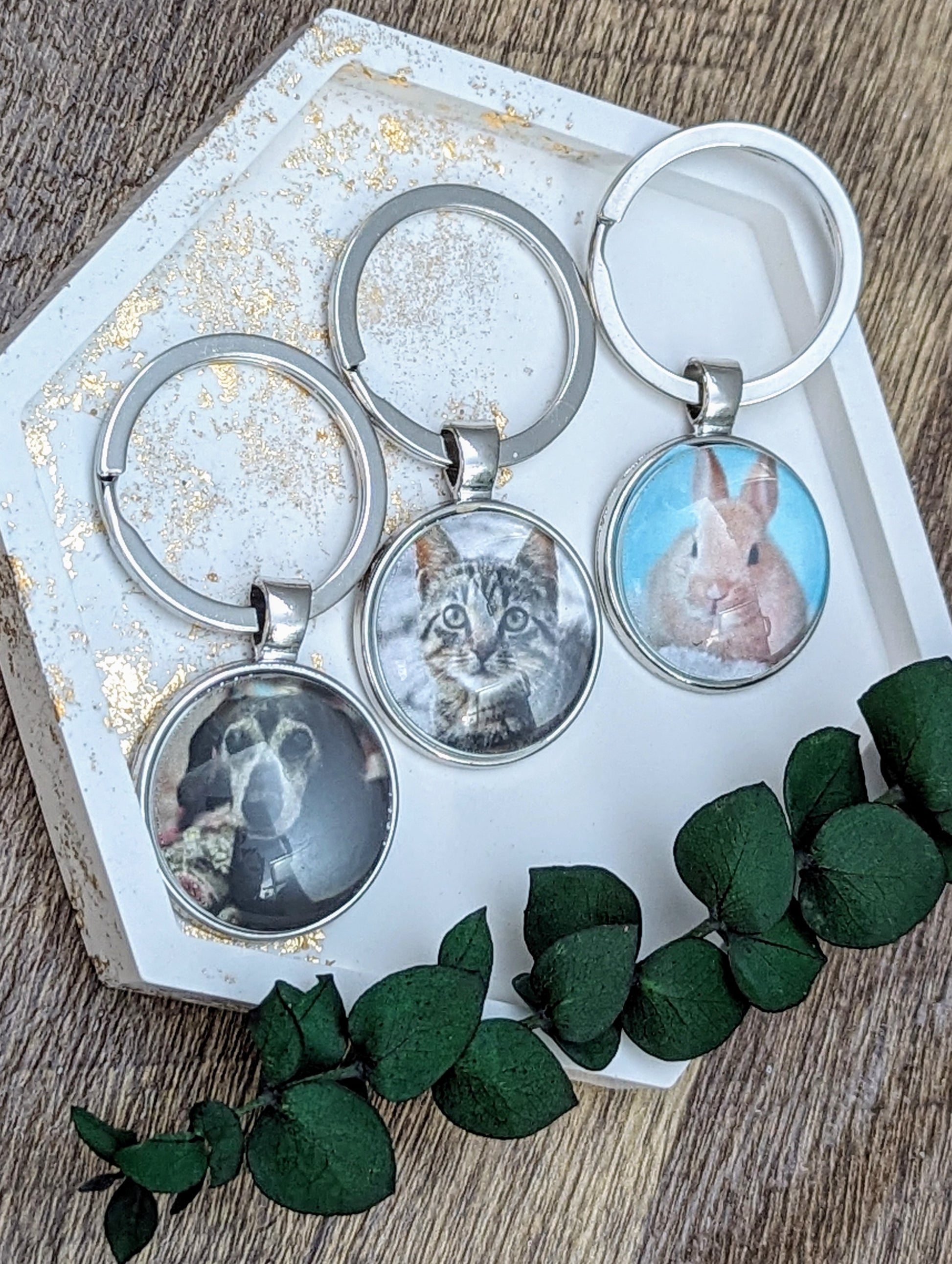 Customizable alloy key rings, with glass cabochon. Measures 61mm long, 27.5mm wide at the ring and 25mm at the cabochon.