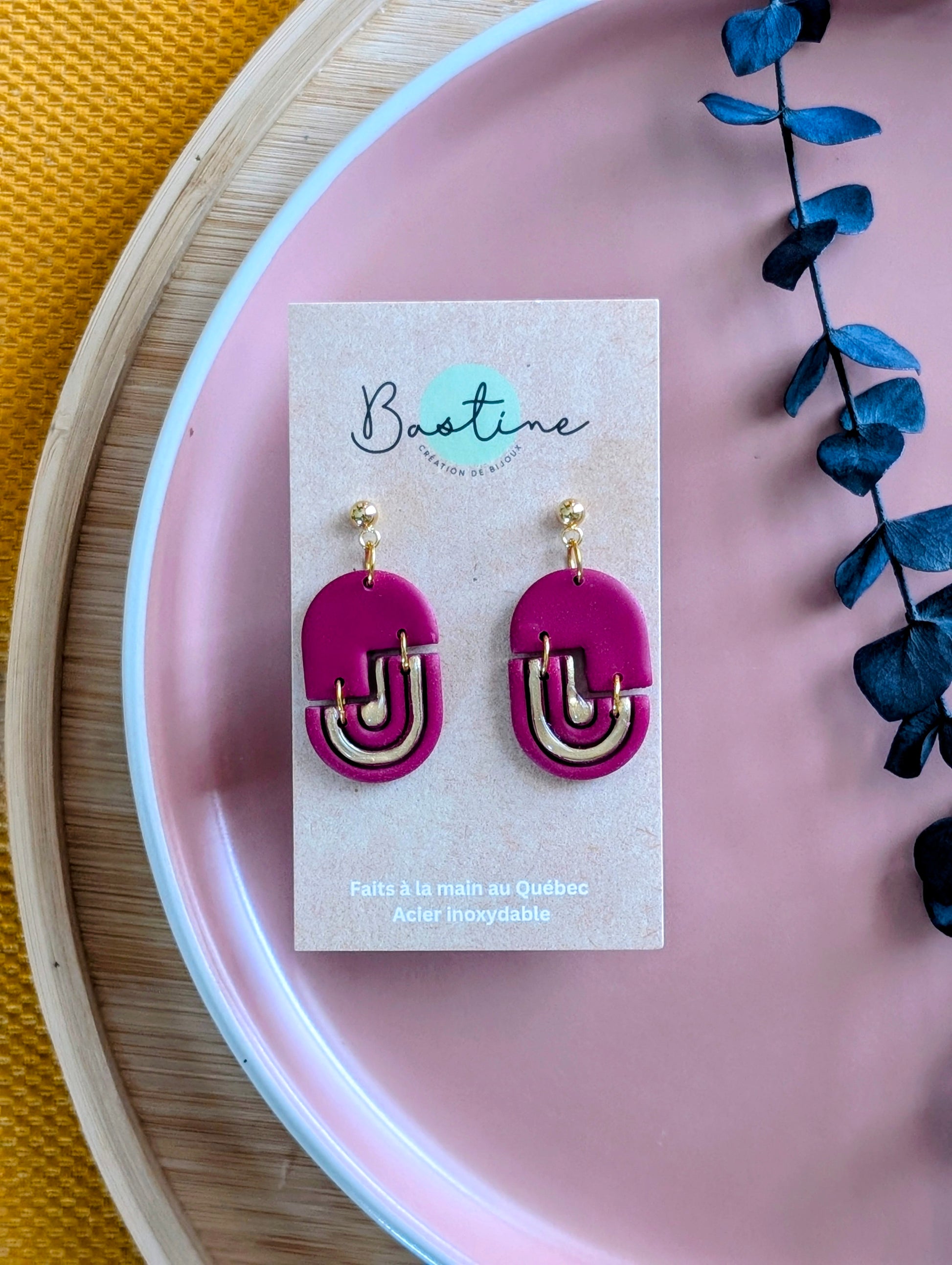 Leïla bourgogne - Boucles d'oreilles pendantes argile polymère et acier inoxydable hypoallergène