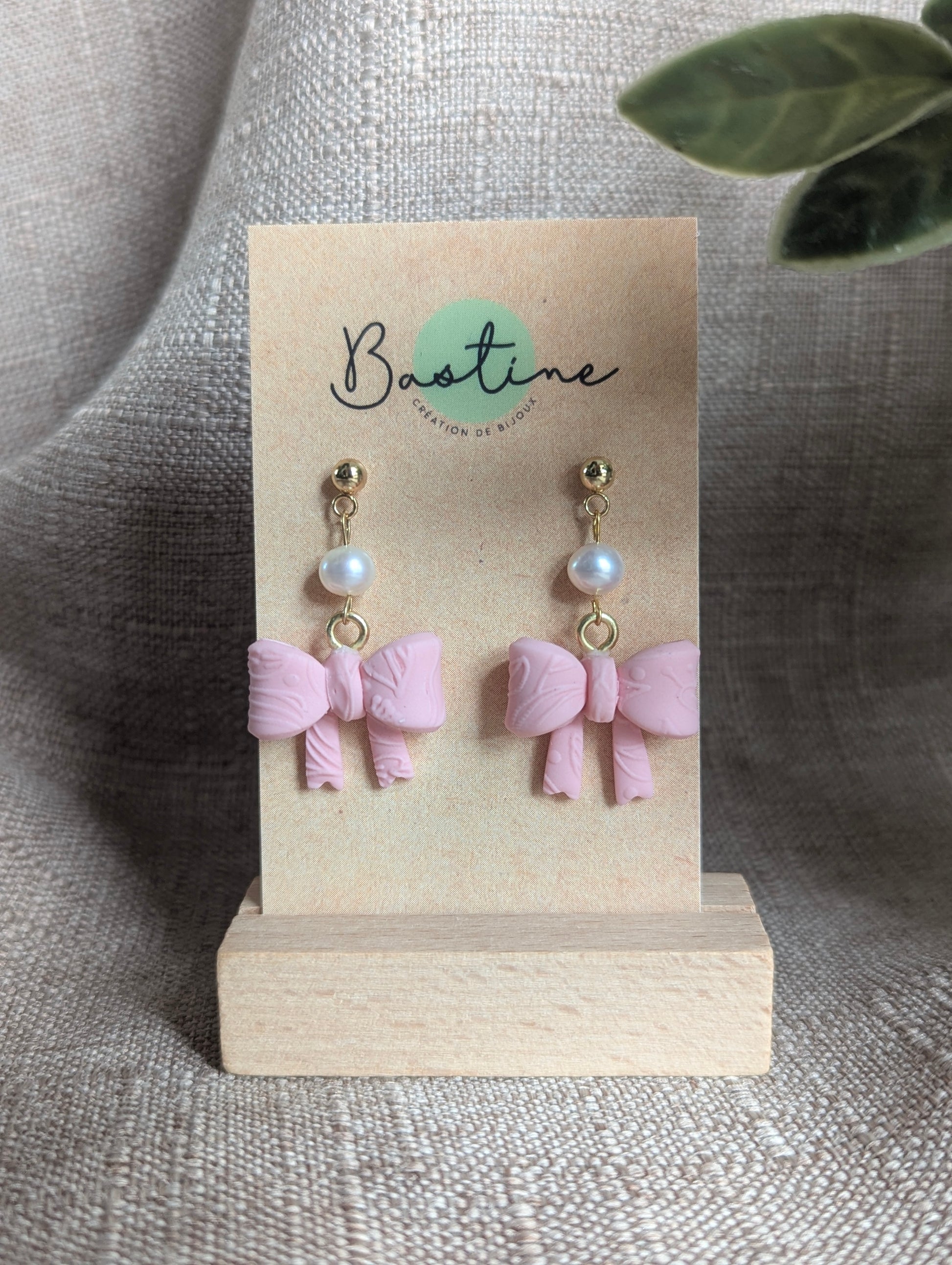 Succombe au charme romantique de ces boucles d’oreilles en forme de nœuds roses, suspendues sous une perle nacrée délicate. Sculptées à la main en argile polymère, les nœuds présentent un subtil motif embossé de papillons qui ajoute une touche poétique à l’ensemble.