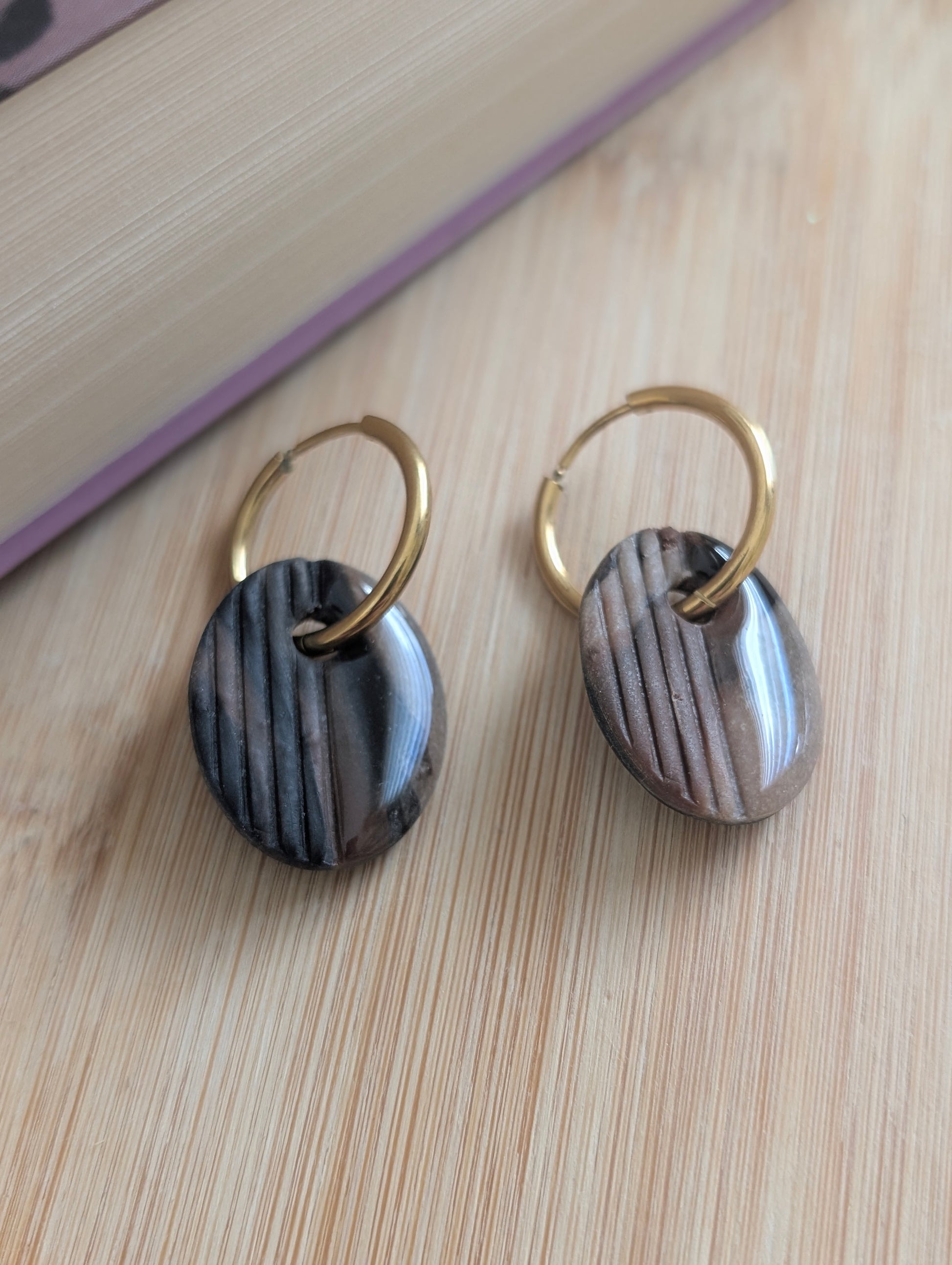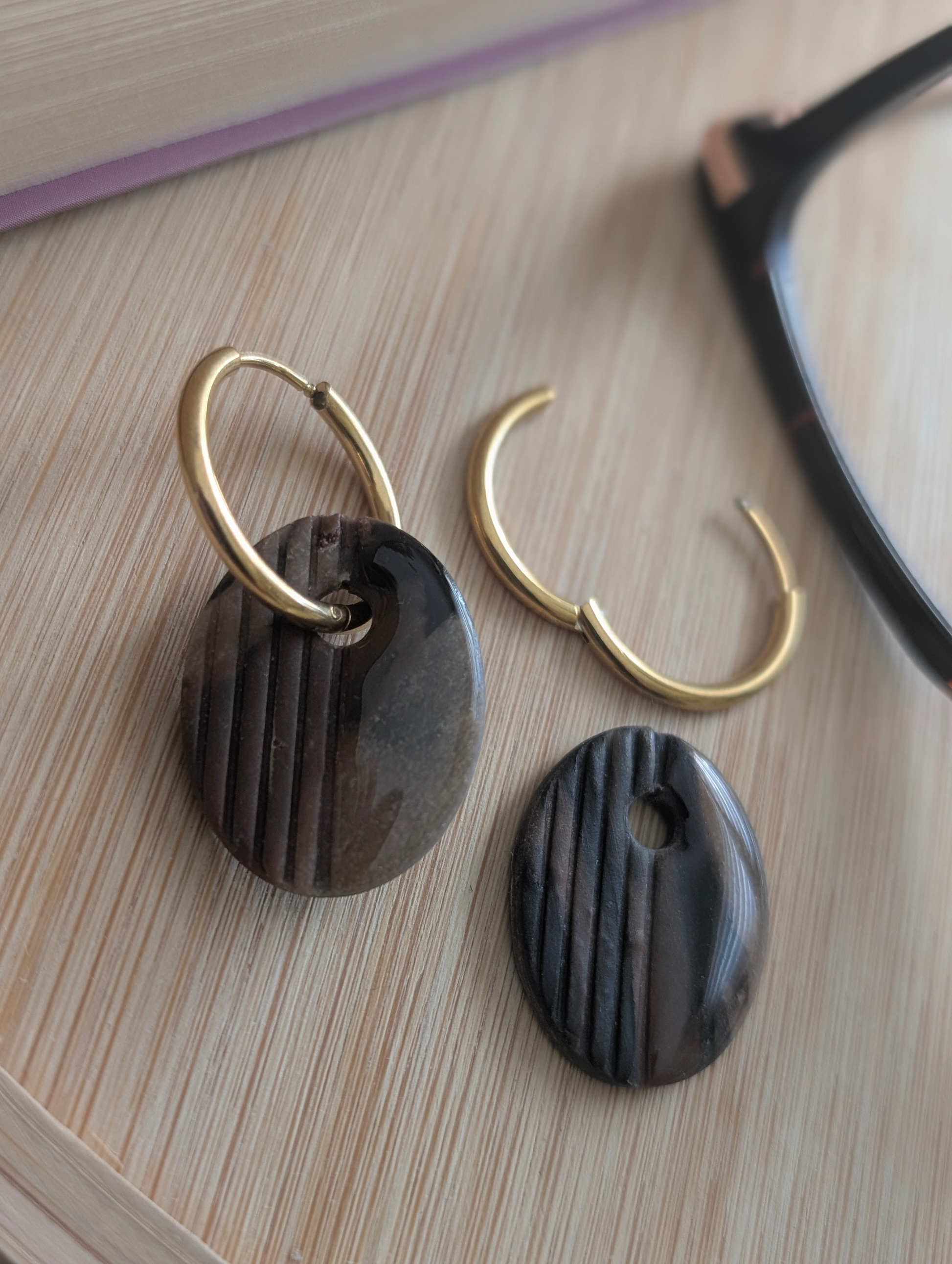Chaque breloque est façonnée à la main au Québec en argile polymère, avec un motif tortoiseshell unique. Montées sur des anneaux en acier inoxydable plaqué or, ces créoles sont durables, légères et confortables pour un port prolongé.