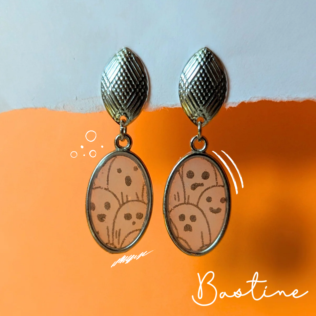 Jolies boucles d'oreilles pendantes ovales avec motif de fantômes. Environ 4 cm de long, tiges hypoallergènes en acier inoxydable.