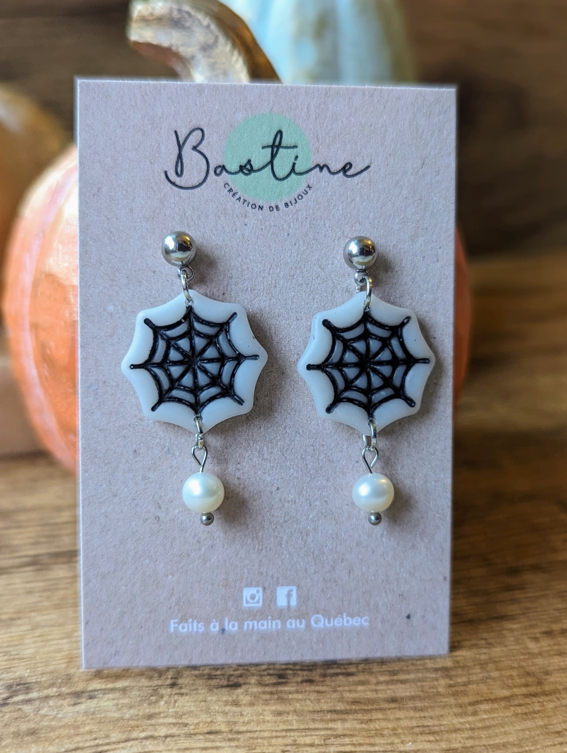Boucles d'oreilles pendantes en forme de toile d'araignée blanche, avec perle d'eau douce. Environ 4.6 cm de long.