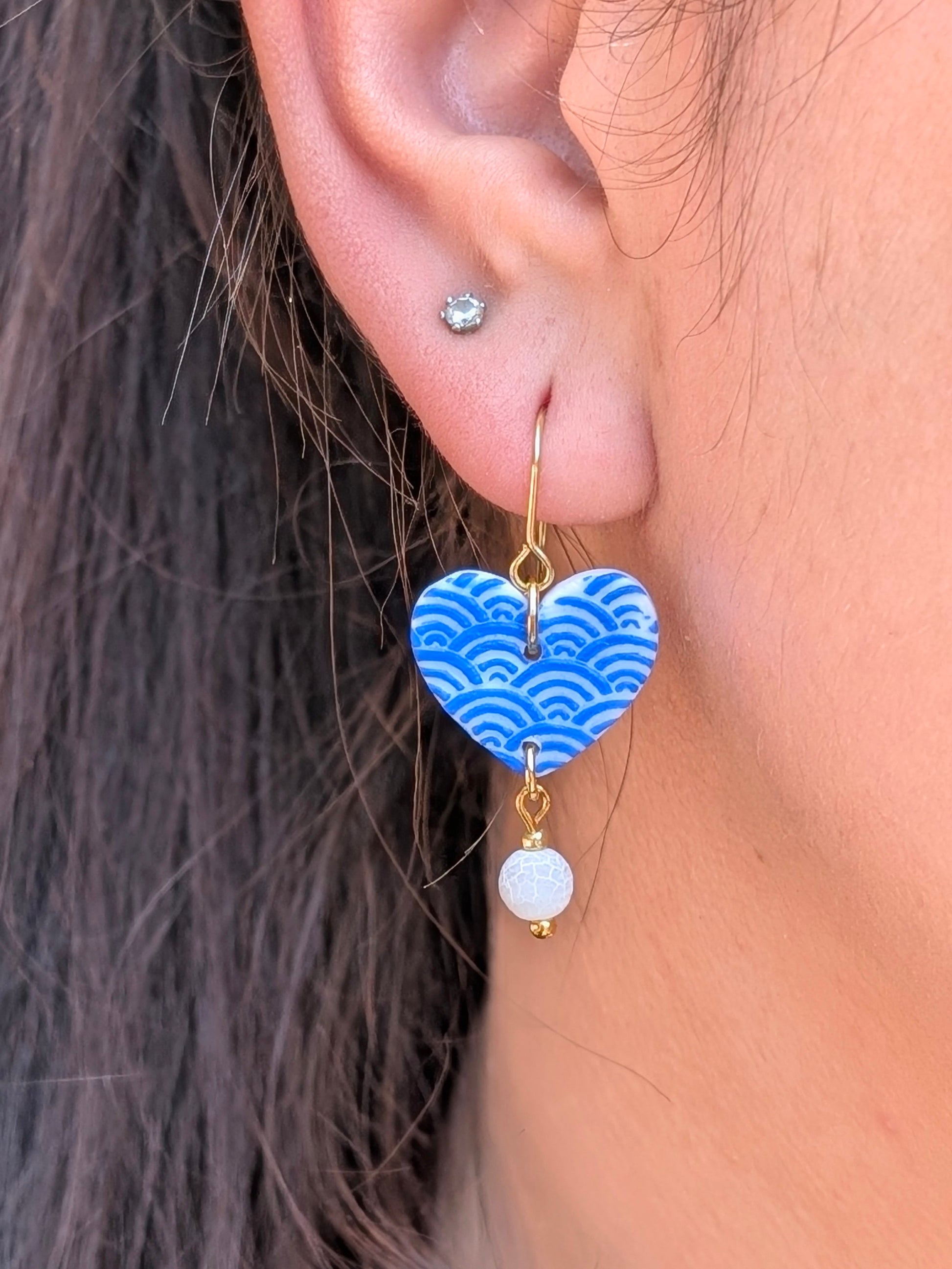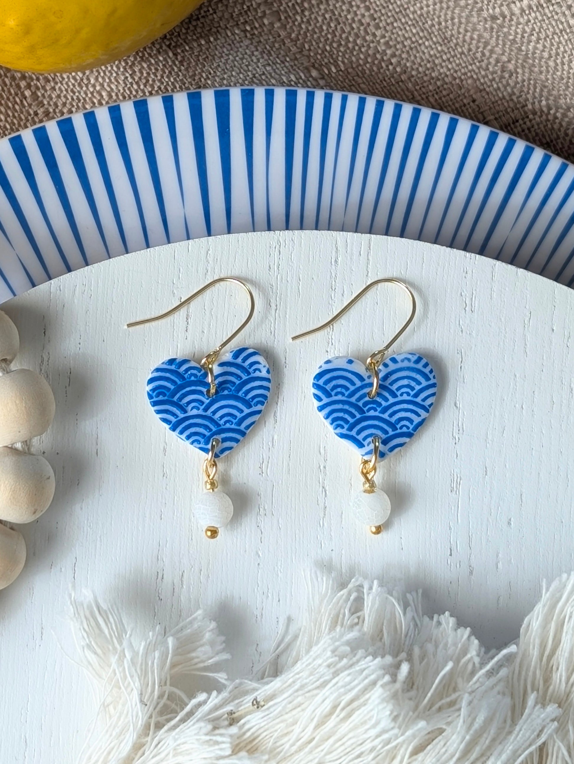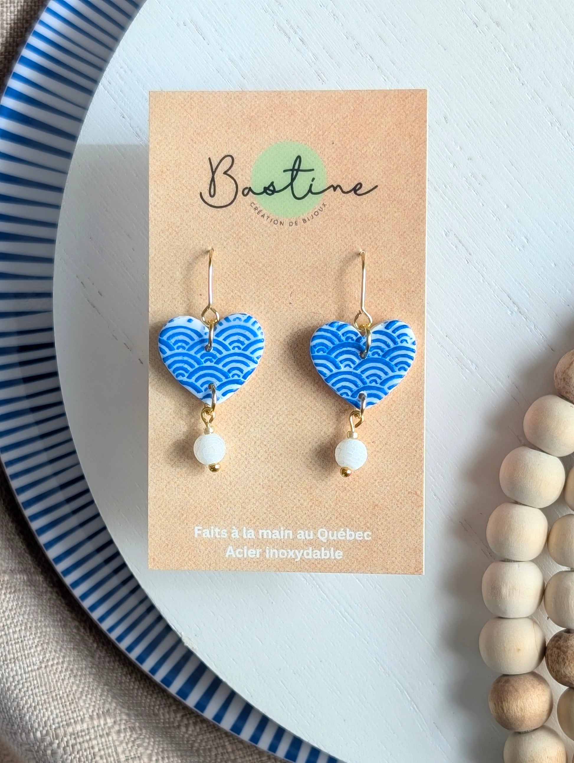 Les boucles d’oreilles Karina incarnent la fraîcheur et l’élégance de la mer avec leur motif bleu océan inspiré des vagues et des paysages de la Grèce. Leur forme cœur apporte une touche romantique, tandis que la perle blanche suspendue ajoute finesse et luminosité.