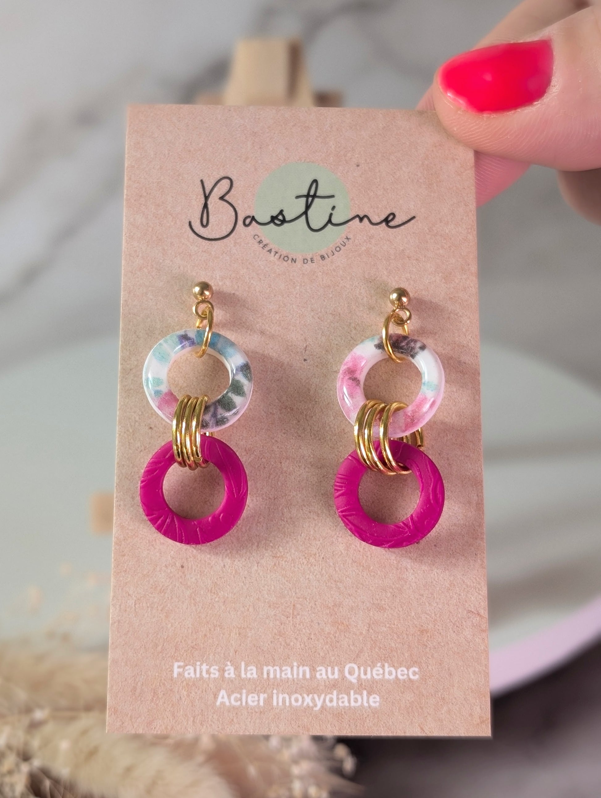 Karina fuchsia - Boucles d'oreilles pendantes en argile polymère et acier inoxydable hypoallergène