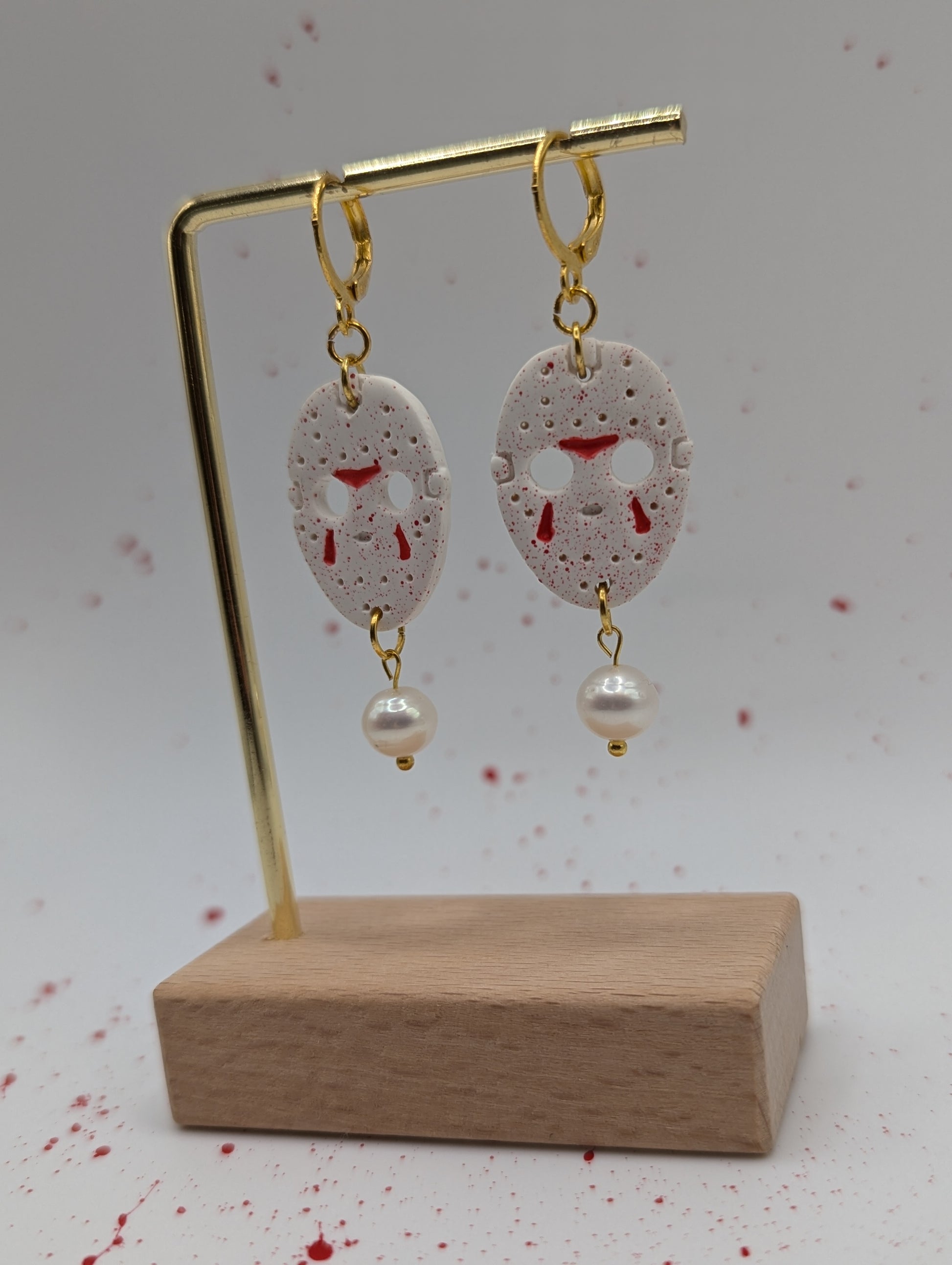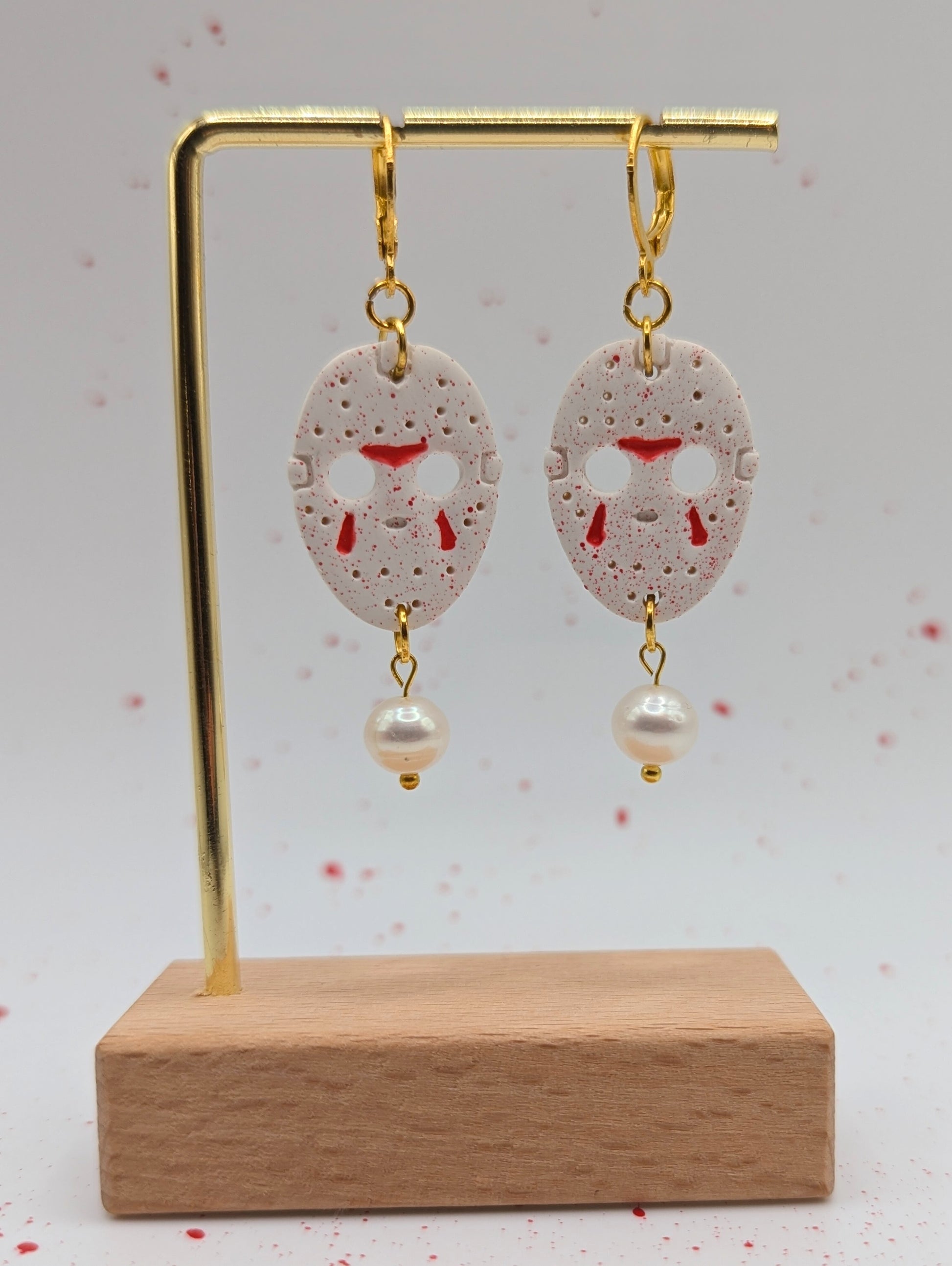 Affichez votre passion pour l’horreur avec ces boucles d’oreilles pendantes inspirées du célèbre masque de Jason dans Vendredi 13! Conçues en argile polymère et agrémentées de perles d’eau douce, elles allient originalité et élégance pour un style audacieux.