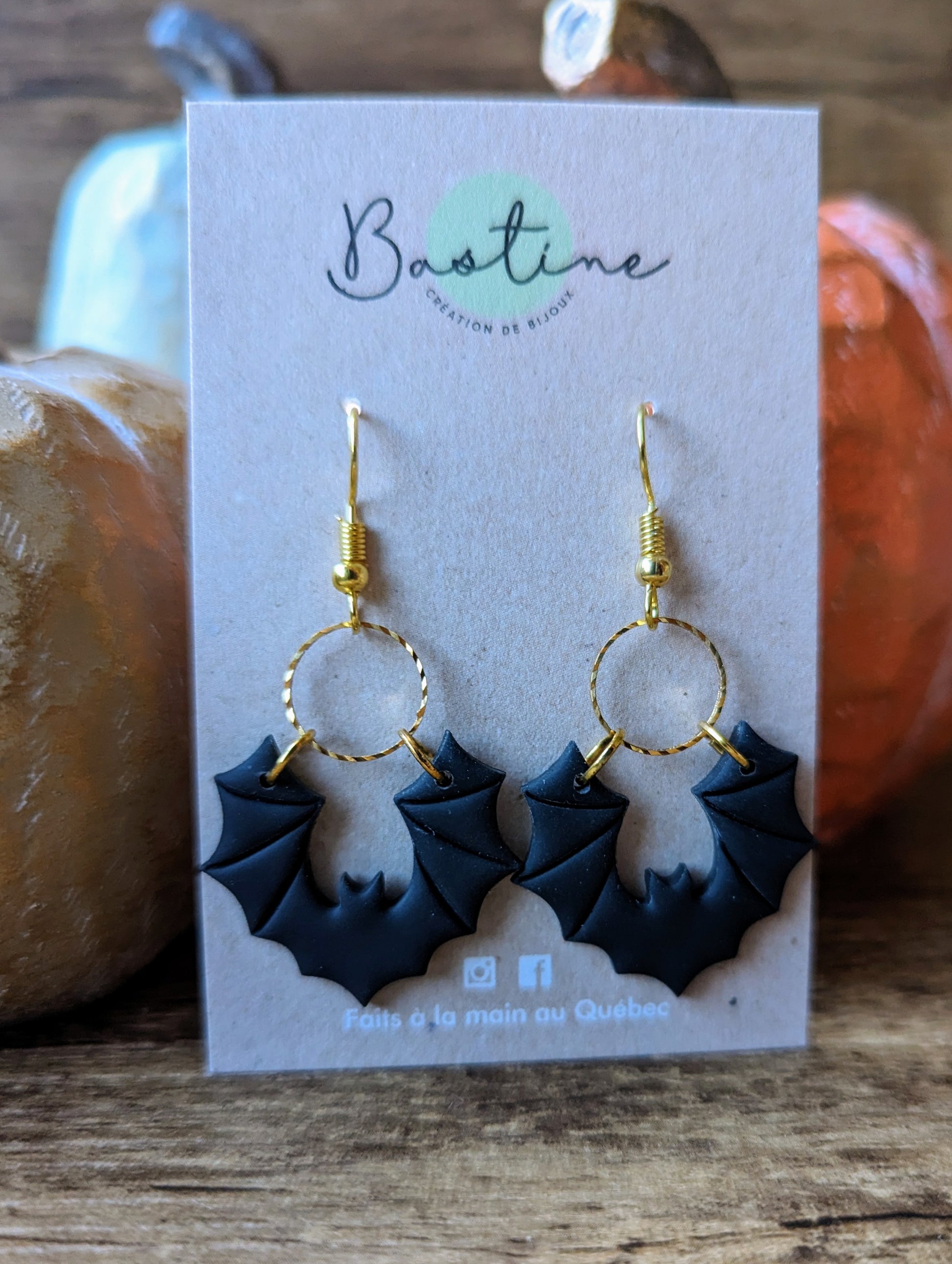 Boucles d'oreilles pendantes Chauve-souris avec anneaux argents ou dorés. Environ 5 cm de long.