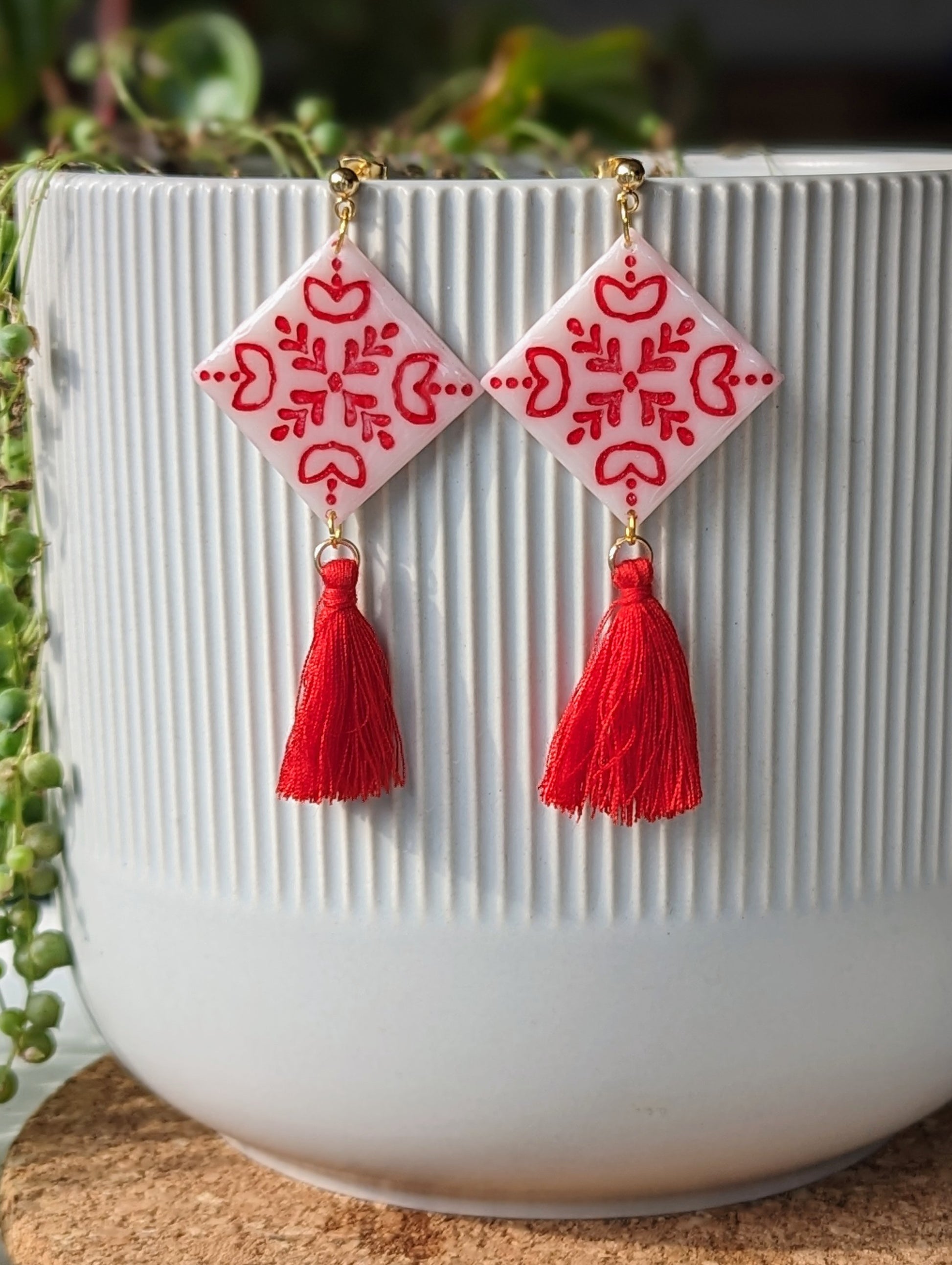 Boucles d'oreilles pendantes blanches et rouges avec pompons rouges assortis.