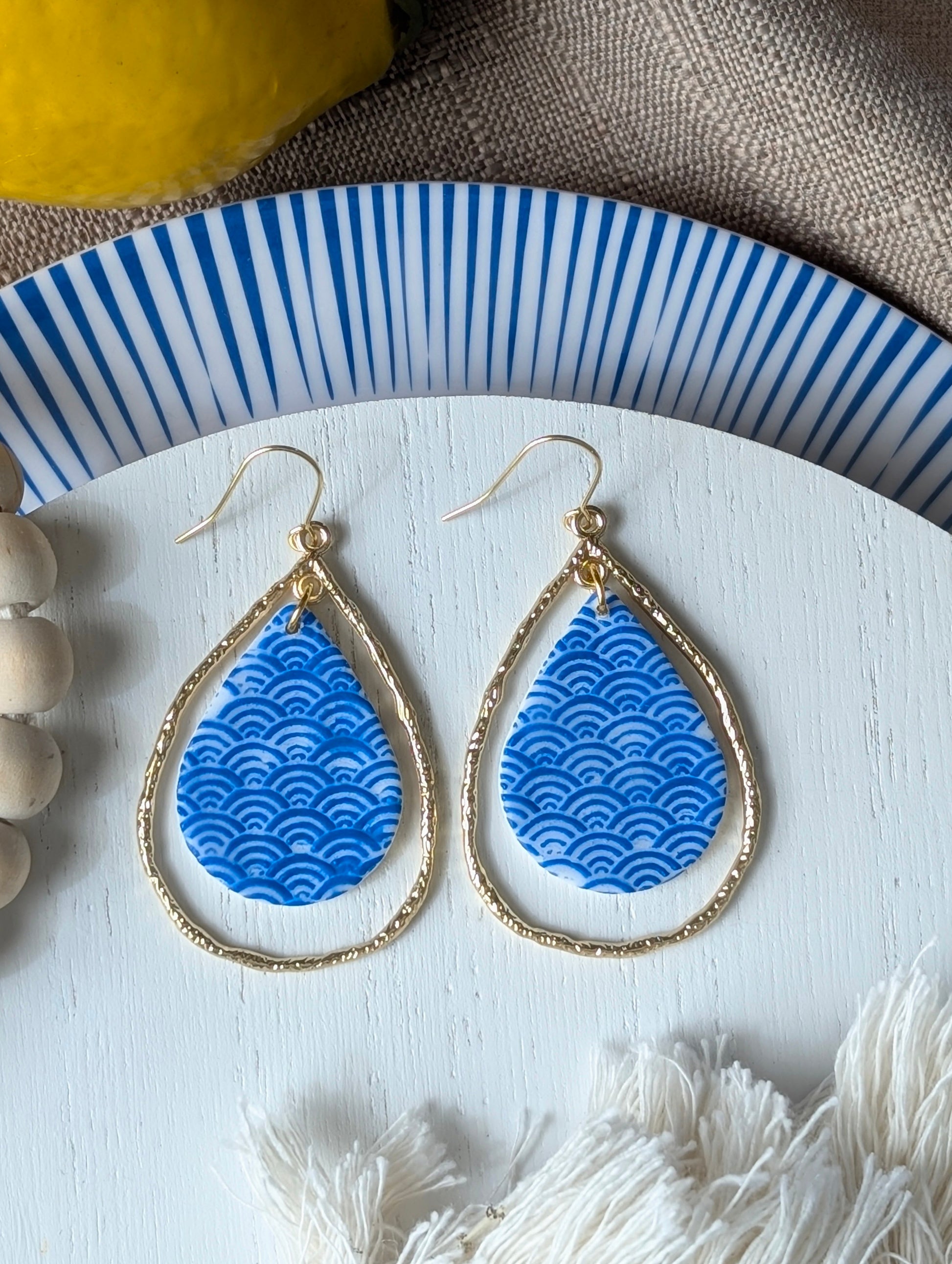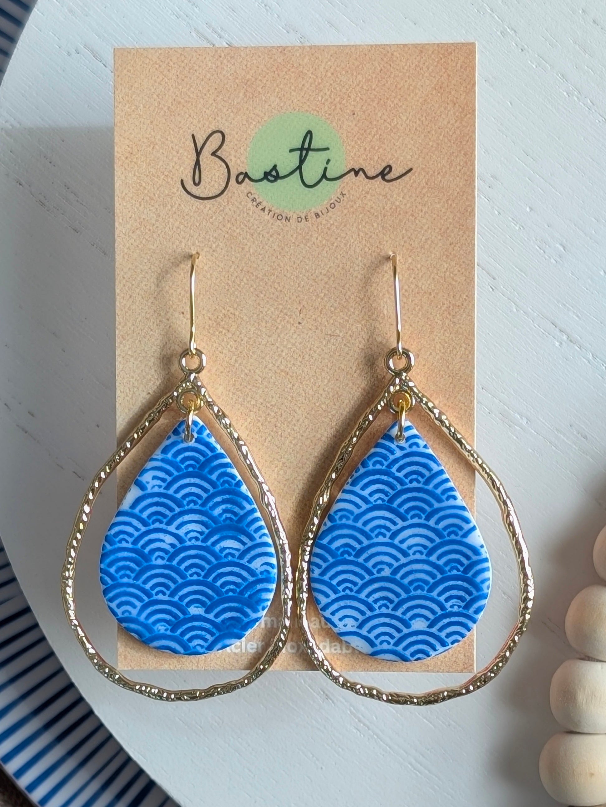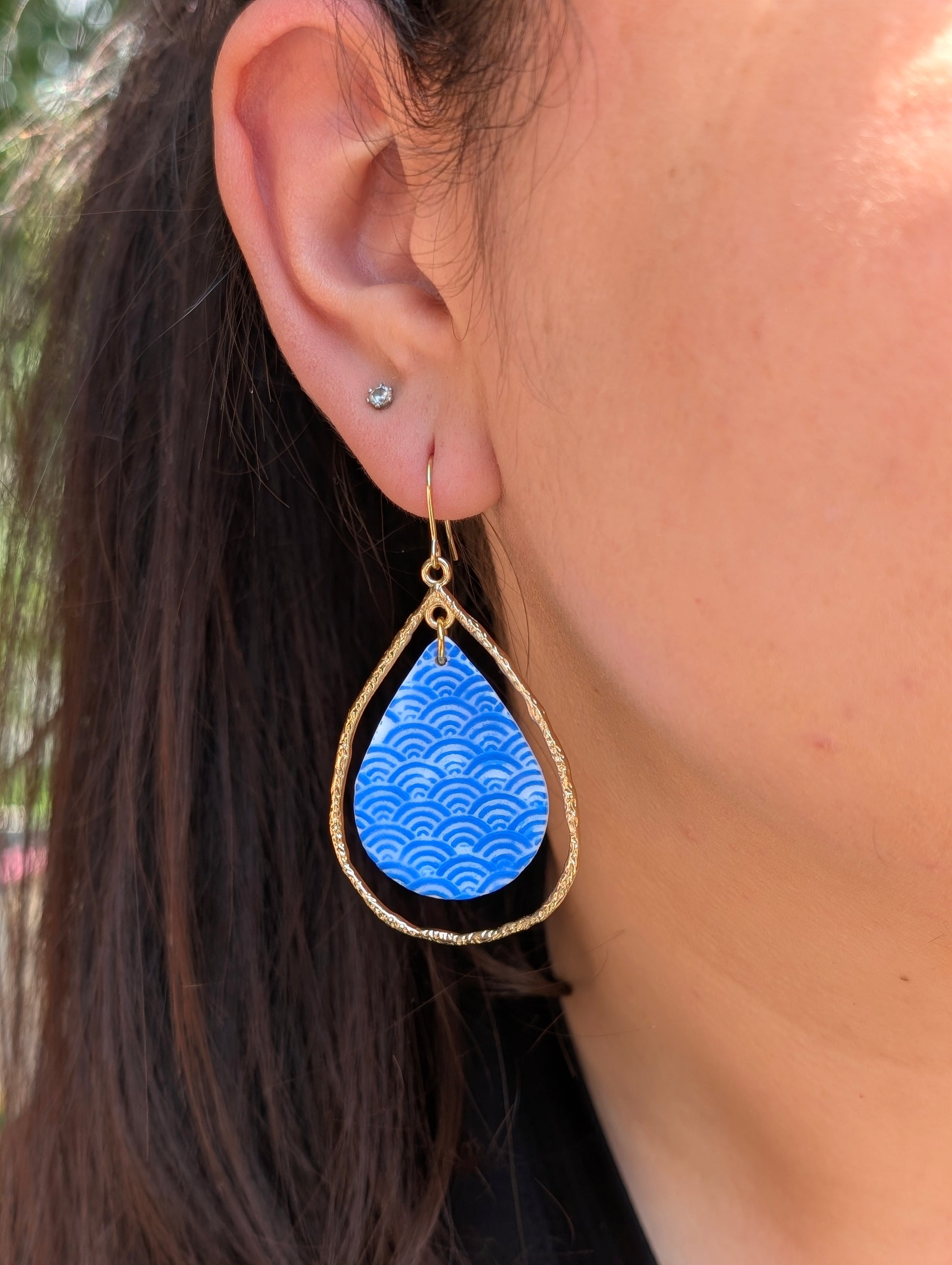 Avec leur élégante forme goutte et leur motif bleu océan rappelant les vagues méditerranéennes, les boucles d’oreilles Tamara allient fraîcheur et raffinement. Un délicat accent doré vient sublimer le design, apportant une touche de lumière et de modernité.